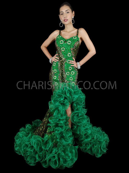 Green Sequin Gown With Crystalized Embroidered Appliques and Ruffed Organza