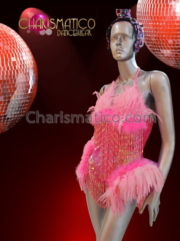 Halter Style Black Sequin Leotard With long Beaded Fringe