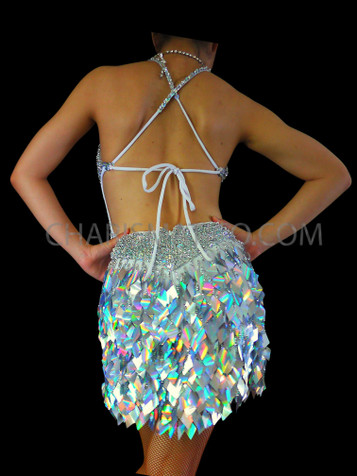 This Latin dress has the classic halter top styling that makes it easy to adjust to the perfect fit. Coupled with this detail are iridescence in the form of white sequins and lovely organza ruffles. One could be an angel in this dress.