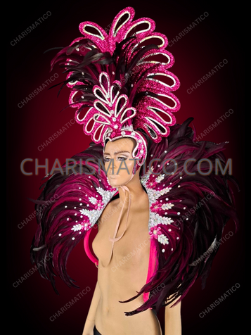 The ever popular clean curves of the Art Deco period are presented here in silver glitter with crystal highlights. The neon green feathers on this headdress and matching collar backpack would pair with great delight with both a pageant gown or a showgirl's outfit.
