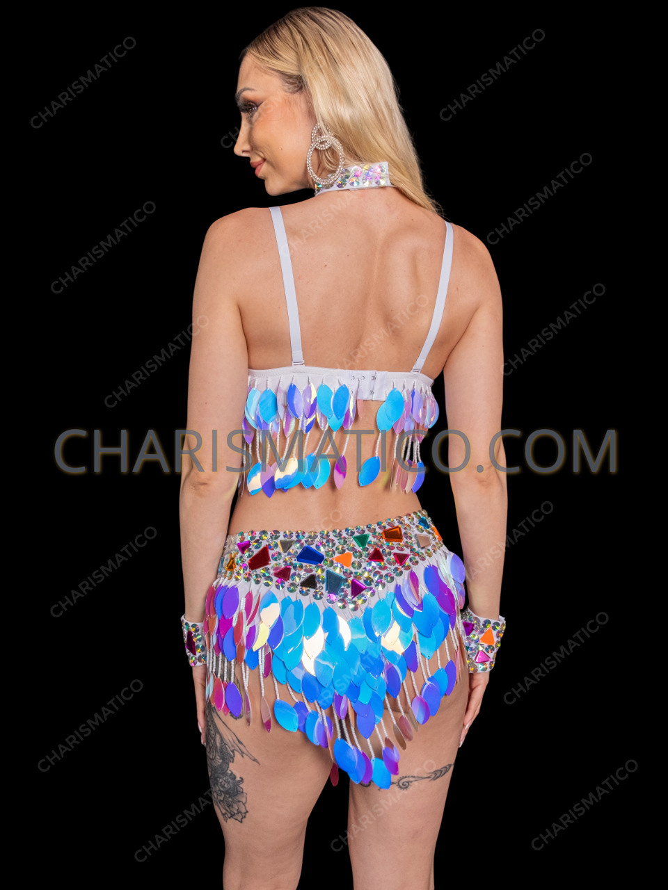 The Holographic Electric Pearl Sequin Rave Two-Piece Set is designed to turn heads at the world’s most iconic music festivals, from Tomorrowland, Ultra Music Festival, EDC Las Vegas, Coachella, Burning Man, EXIT Festival. Featuring luminous pearl white sequins that glow under lasers and stage lights, this set is elevated with multi-color stones lining the edges of both the bra and skirt for a bold, prismatic finish. Designed for nonstop dancing and unforgettable nights, the shimmering fringe and crystal details move effortlessly with every beat, making this set the ultimate statement look for rave lovers and festival fashion icons worldwide.