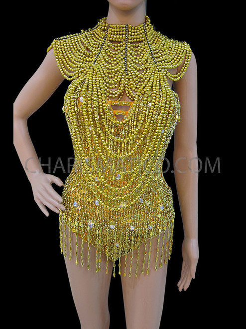 • A stunning customized beaded leotard with matching beaded necklace that is perfect for stage performers and dancers.
