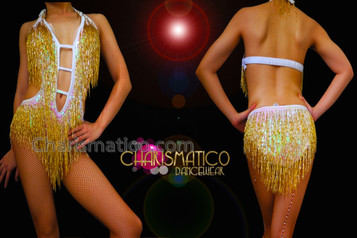 Liquid Metallic Gold Sequin Latin Dancer Leotard With Beaded Fringe