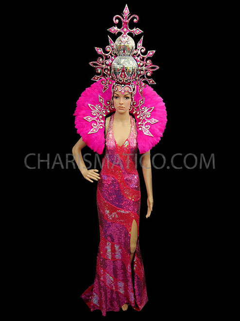 Long Pink Sequined Pageant Gown With Matching Headdress And Collar Set