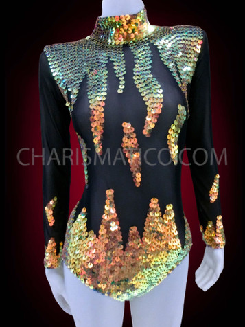 Here is an exciting look for the ages. A sleek black leotard with gold sequin flame patterns on it gives you one extra hot look. This beauty can pair with other items or be worn alone as a dancer's costume. Long sleeves to keep your modesty intact.