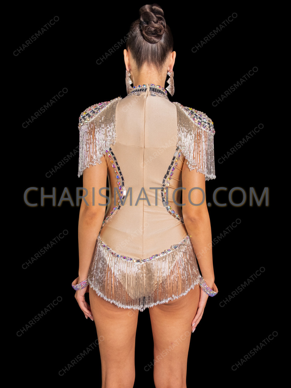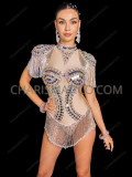 Luxe Nude Illusion Mirror-Studded Showgirl Bodysuit with Shoulder & Hip Fringe