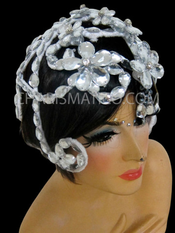 This cabaret crystal headpiece is a stunning accessory that can add glamour and sparkle to any performance. It consists of a metal band that fits around the head, adorned with crystals of various shapes. The crystals catch the light and create a dazzling effect, drawing attention to the face and hair of the wearer.