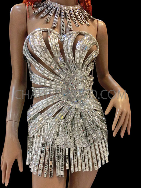 Sexy and sleek this mirror tiled corset has cutouts to enhance the design and let you breath under the spotlight. Paired with a fringed mini skirt it is a sure winner. Make yourself into a sex goddess of the future with this sleek fashionable set.