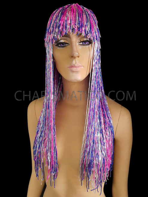 The classic blunt cut beaded wig is forever associated with “Cher”. This one is made of pastel rainbow hues with a heavy golden slant so it gives the appearance of being blond from a distance. It is lush and rich in texture, able to move as you do, just like hair, and will catch the light beautifully.