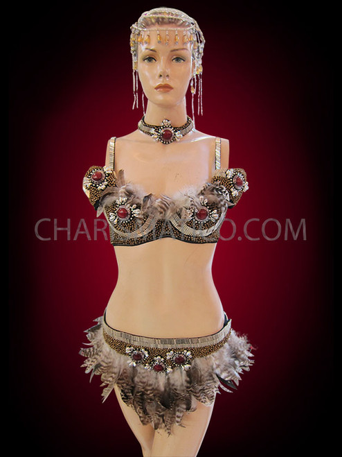 • A customized feather and sequin bra and skirt set with matching choker necklace and wrist cuffs that is perfect for showgirls, cabaret and burlesque, Carnival, or parades.