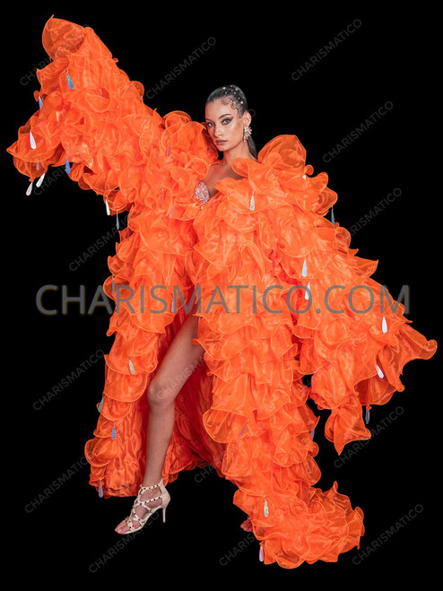 Neon Orange Organza Ruffle Drag Queen Coat with Teardrop Sequin
