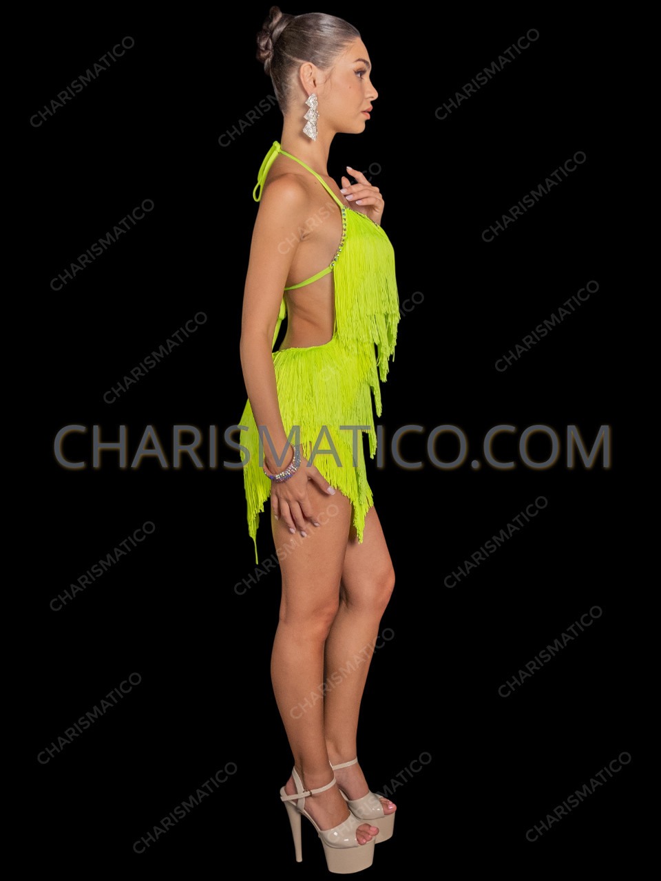 Light up the stage in this Neon Yellow Fringe Latin Dance Bodysuit Dress, designed to capture every shimmer and sway. Crafted from premium stretch Lycra fabric, it offers a sleek, body-hugging fit that moves effortlessly with your performance. The bodice features dazzling crystal embellishments along the neckline, adding a touch of luxury and sparkle that catches the spotlight from every angle. Layers of vibrant pink fringe cascade beautifully down the body, creating dynamic motion and irresistible energy with each step. Perfect for Latin, salsa, and showgirl performances, this bold and glamorous piece ensures you’ll shine with confidence and charisma on stage.