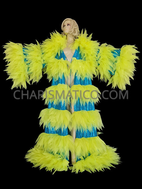 Neon Yellow Turquoise Showstopper Drag Dramatic Fluff Coat