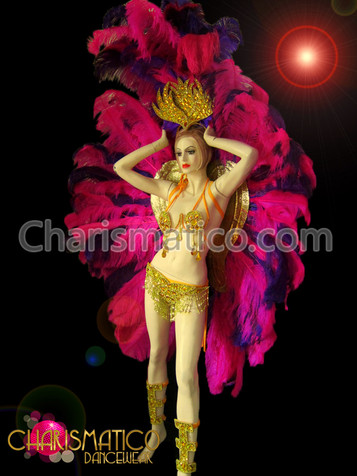 Stunning gold and amber toned crystals form the foundation for this matching headdress and backpack set.  Lush, exotic, premium ostrich feathers in fiery red and orange frame the body and give every move echoing sway as only ostrich feathers can do.