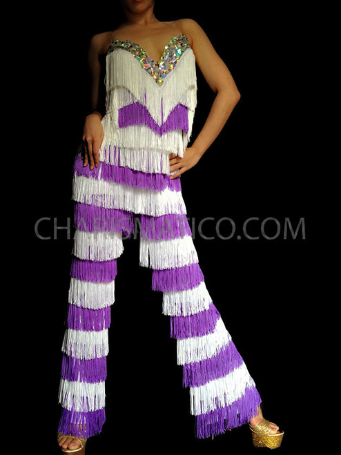 Fringe pants are a great way to have coverage yet look sexy. This white and purple striped outfit is perfect for generating heat on the dance floor, without even trying. Go with something different next time you need to wow the judges with this Latin fringe dance pants!