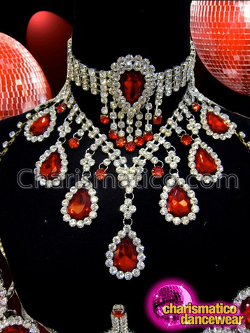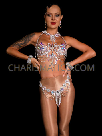 Looking for a glamorous costume to steal the show? Look no further than this stunning bra and belt set! Perfect for showgirls and stage performers, this costume is made with gleaming crystals, creating an opulent appearance. Featuring a ravishing crystal AB flower on the bra cups, this set adds a feminine touch to your performance. The belt is adorned with crystal fringe that delicately dangles, making you feel confident and sexy on stage. You won't have to worry about discomfort while dancing the night away!