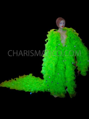 • A beautiful ruffled organza coat that is lined with satin on the inside.