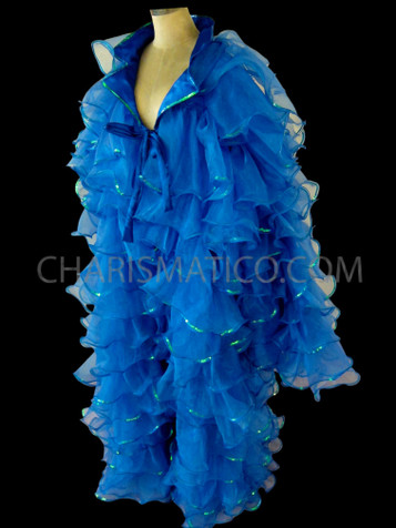 If you live for color then royal blue likely calls to you like no other shade. Here it is combined with iridescent organza flame-ruffles that flow off this drag queen coat liberally.  Additional interest is provided through white accents on the neck.