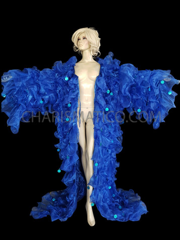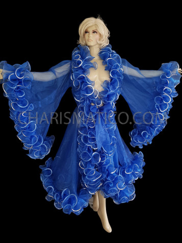 Royal Blue Organza Flame-Ruffled Drag Queen Coat With White Trim
