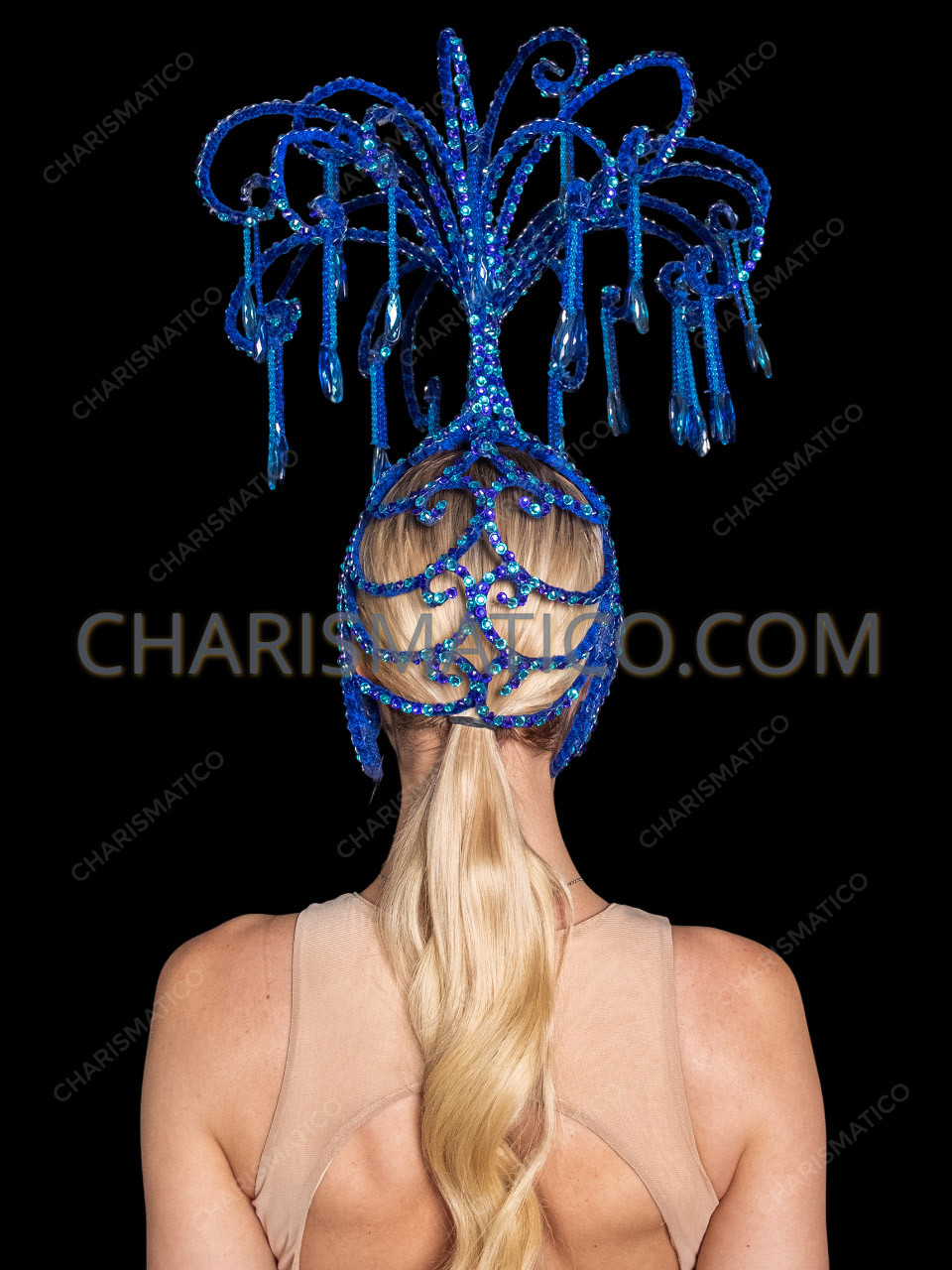 Sapphire Fountain Crystal Showgirl Headdress with Dangling Teardrop