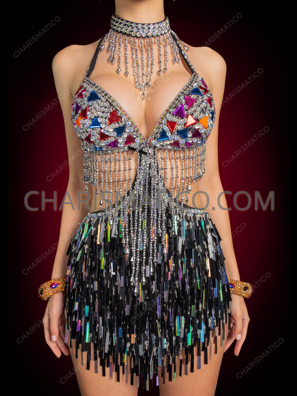 Shine brighter than the spotlight in the Sexy Crystal Mirror Rectangular Sequin Fringe Festival Dress. This daring halter mini dress features a sparkling bra top adorned with multicolor crystal mirrors that catch every flicker of light. Cascading rectangular sequin fringe shimmers with every move, creating an irresistible flow perfect for dancing and stage performances. The open-back halter design enhances your curves, while the playful mini length adds just the right amount of sex appeal. Ideal for drag shows, cabaret, festivals, and nightclub performances, this dress ensures all eyes stay on you from the first step to the final pose.