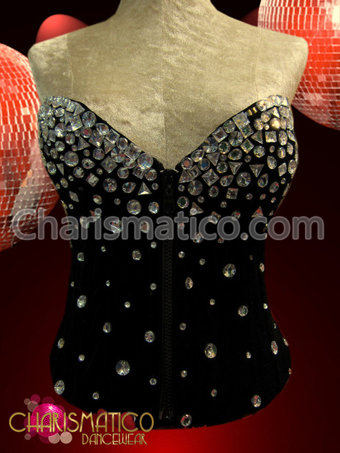 sometimes you do not want or need a long wasted corset. Sometimes the ideal shape is just like this sleek black version with a zipper front and crystal trim. It is not quite basic, given the embellishment, yet it would go well with pants or skirt alike.