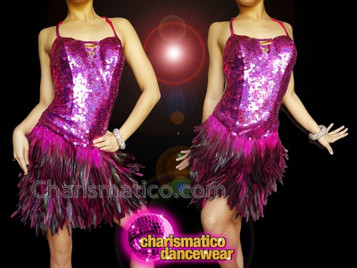 This is a stunning fun and frilly fuchsia short dance dress. The ruffled underskirt has a silver trimmed edge with a ruffled belt near the waist. The top is sequined with fuchsia sequins and paired with a gaga style short fuchsia sequined jacket.