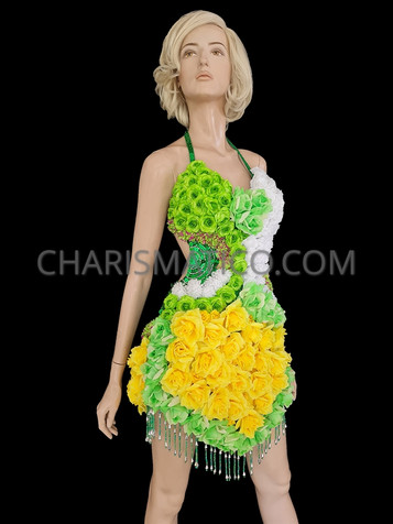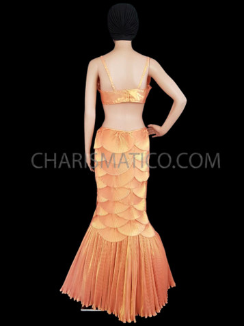 This is a sissy dance dress for drag queens out there. The combination of bright orange and silver gives an intense sexy appearance. The orange underskirt is lined with silver trimmings at the borders. The top is silver sequined having a sheer texture in the middle. This dance dress is paired with a bright orange collar.
