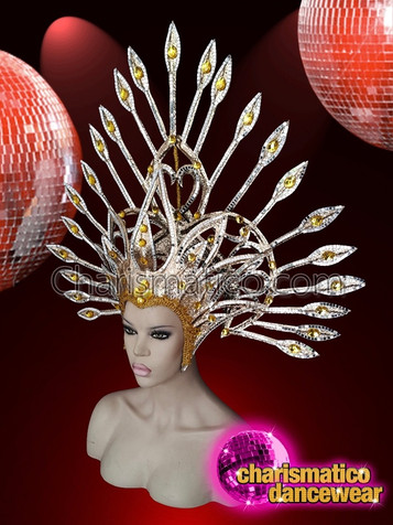 Designed for the boys, elegant enough for a bold and daring Drag Queen, this headdress is a little native and a little exotic, but one hundred percent commanding of attention. Be it for a king, champion, or warrior queen this piece holds its own.