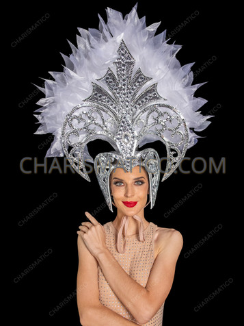 Radiate elegance and majesty in the Silver Rhinestone Fantasy Headdress with White Organza Leaf Plumes, a breathtaking crown fit for queens of the stage. This dazzling headpiece features an intricate silver rhinestone structure with swirling baroque-inspired motifs that shimmer from every angle. Rising from the crown, ethereal white organza plumes shaped like delicate leaves fan out gracefully, creating a soft yet powerful silhouette. The sculptural design ensures high drama without the weight, making it ideal for drag shows, showgirl performances, and theatrical spectacles. Regal, radiant, and exquisitely crafted, this headdress transforms any entrance into a moment of pure fantasy.