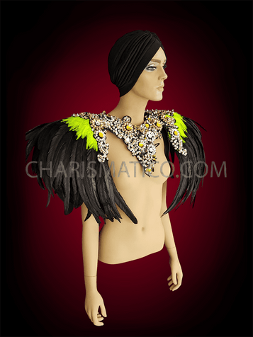 Sleek Beaded Base Sequined Black Feathered Headdress And Collar Set