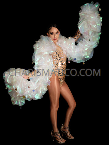 This slinky dress has oodles of sheer iridescent organza in the purest of white color. The unique skirt is not your typical ruffles, instead forming clouds of shimmer all around you. This gives it a slimming charm that is form fitting and flattering.