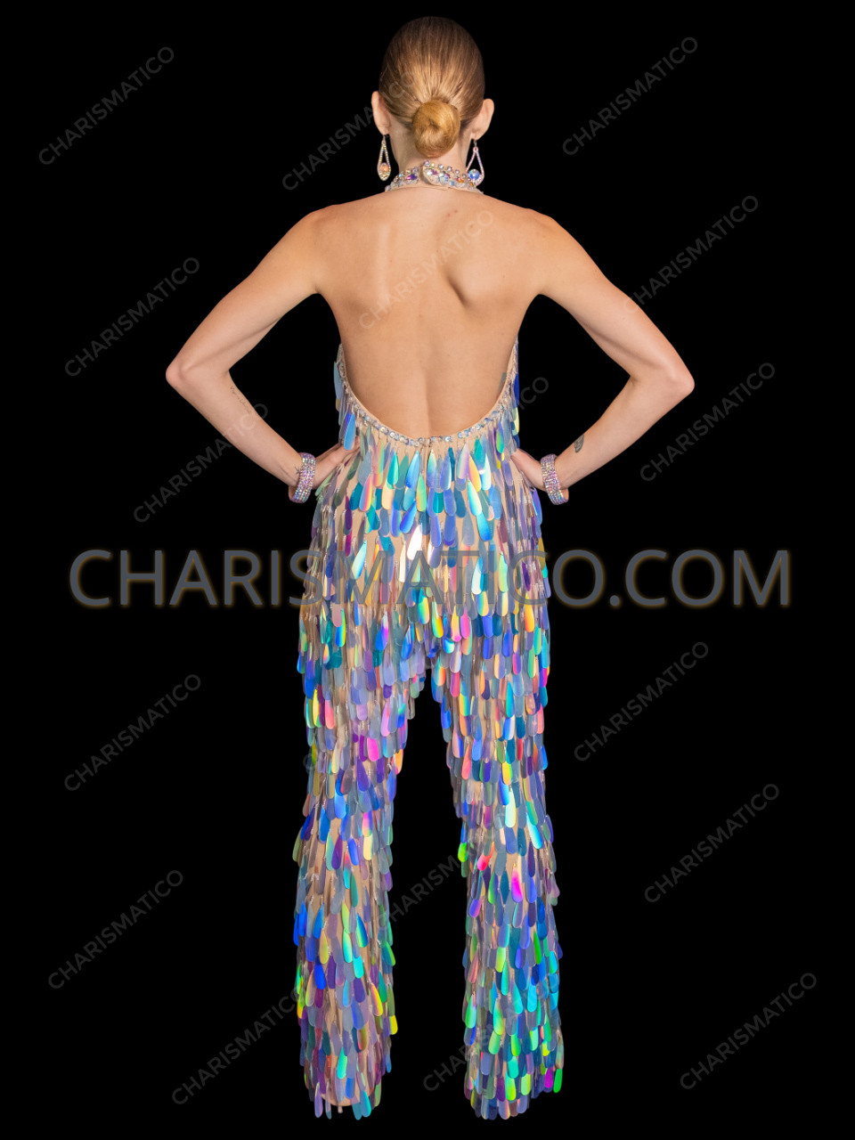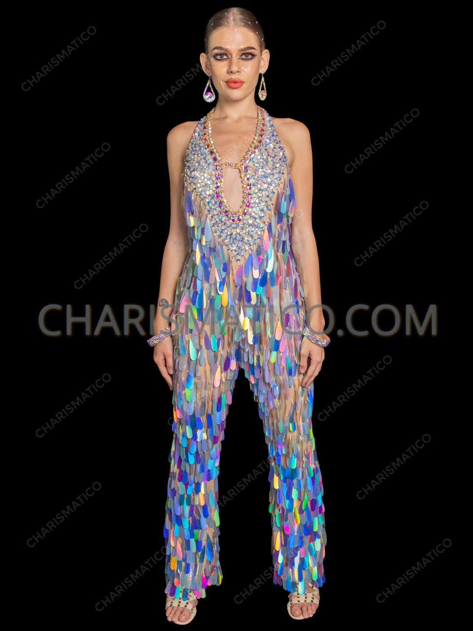 • Sequins: Large, transparent teardrop sequins embellish the entire jumpsuit.