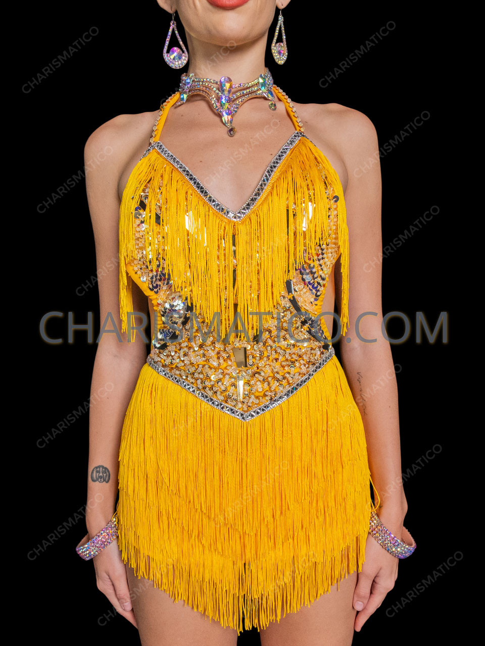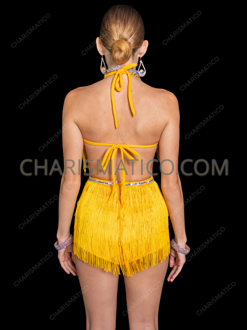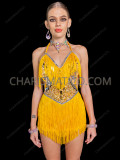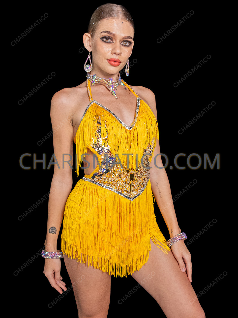 Bring fiery energy to the stage with this Sparkling Yellow Fringe Salsa Dance Dress, designed to move as effortlessly as you do. Adorned with layers of vibrant yellow fringe, the dress creates dynamic motion with every spin, step, and shake, making it perfect for high-energy Latin dance performances. The bodice is embellished with shimmering sequins and rhinestone accents, adding dazzling sparkle under the lights while highlighting your figure. With its halter neckline and flattering fitted waist, this dress combines bold color, glamorous shine, and fluid movement—ideal for salsa, samba, ballroom showcases, and showgirl performances.