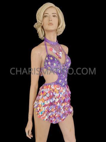 Add some glitz and glamour to your performance collection with this stunning stage dress set. The top is beautifully decorated with mirrors and crystals, which catch the light and create a sparkling effect on stage. The bottom of the dress features sequin embellishments, which add another layer of shine and shimmer to this eye-catching ensemble. This stage dress is made from high-quality materials and features expert construction. The sequins along with sequined fringes are securely attached, so you can dance and move without worrying about them falling off. Wait no longer and get your hands on this stage dress to dazzle the audience with your stunning look!