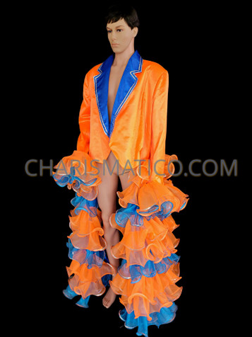 This ruffle drag coat brings out the true extravaganza of a queen. The shade of yellow orange red organza material rightfully gives out the needed ruffled look of this drag coat. The costume is perfect for a drama with a very extravagant theme.