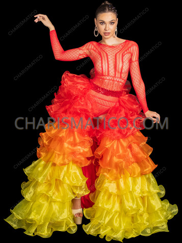 Set the stage ablaze with the Sunset Flame Layered Ruffle Organza Skirt, a show-stopping piece designed to command attention. This voluminous high-low skirt features cascading layers of ruffled organza in a fiery gradient of red, orange, and yellow—reminiscent of a blazing sunset. The dramatic open front reveals the legs for a bold, sultry silhouette, perfect for dancers, drag queens, and performers who love to move with flair. Lightweight yet full of body, this skirt adds movement, color, and unforgettable drama to any performance or stage appearance.