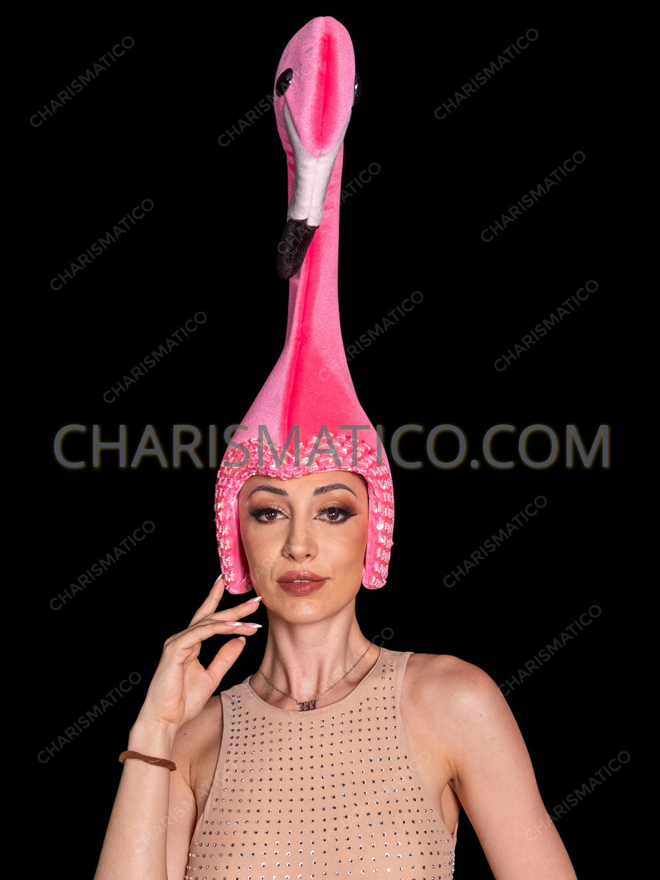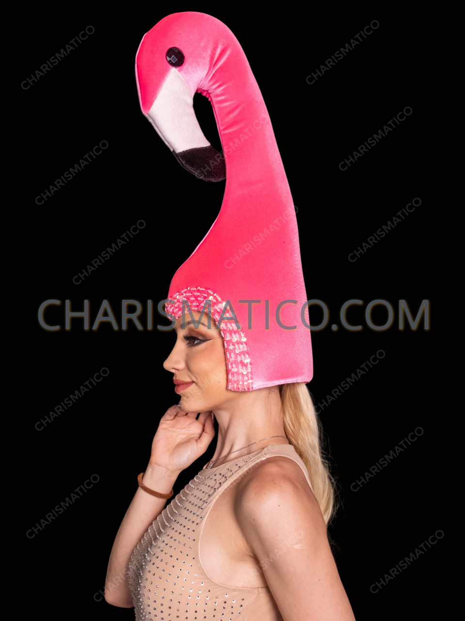 The Tall Pink Flamingo Showgirl Headdress celebrates the iconic elegance and playful spirit of the flamingo, a symbol of tropical glamour, grace, and bold individuality. Inspired by the long, sculptural silhouette of this beloved bird, the headdress features a dramatic vertical design that instantly commands attention on stage or at any event. Crafted from plush pink velvet fabric, it offers a soft yet structured finish that enhances the flamingo’s smooth curves and elongated neck. Hand-decorated with shimmering sequins around the face opening, this piece adds a touch of sparkle reminiscent of sunlit lagoons and vibrant island nights. Perfect for showgirls, carnival performers, festivals, parades, and themed productions, this flamingo headdress brings exotic flair, playful sophistication, and unforgettable visual impact to any costume ensemble.