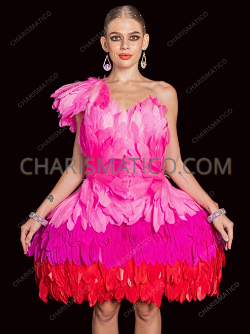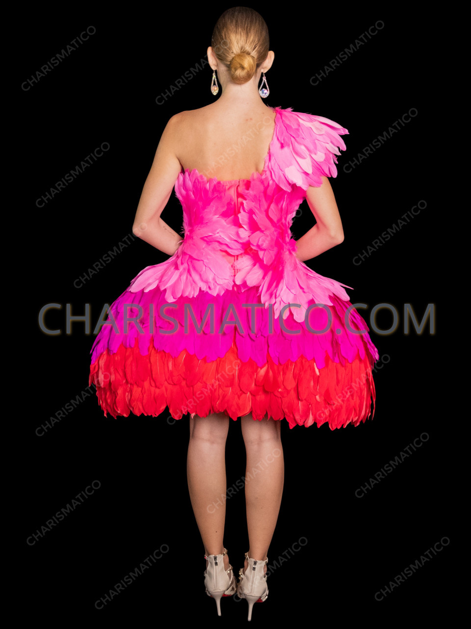 Tri-Color Flamingo-Inspired One-Shoulder Feather Dress