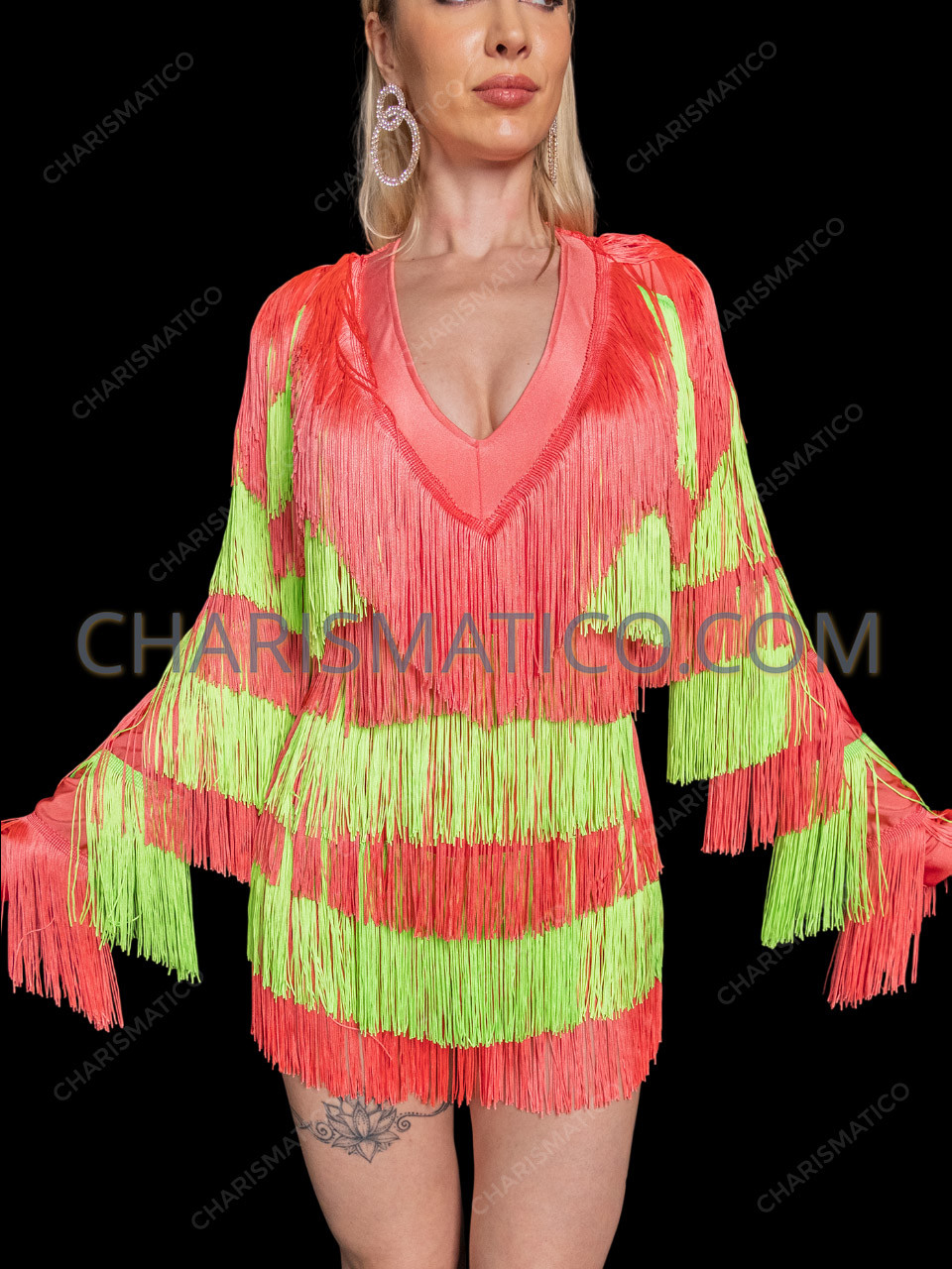 The Two-Tone Long Sleeve Fringe Latin Show Dress is designed to captivate the stage with bold color contrast and unstoppable movement. Featuring flowing layers of fringe in striking two-tone hues, this dress comes alive with every spin, turn, and arm extension—making it perfect for expressive Latin routines and high-energy performances. The long sleeves add dramatic flair and amplify motion, while the open-back design brings a touch of confidence and allure. Eye-catching, dynamic, and full of rhythm, this show dress is made for dancers who want to stand out and command attention from every angle.