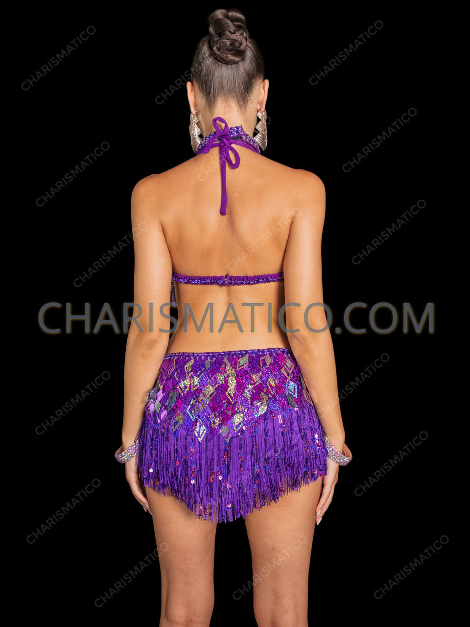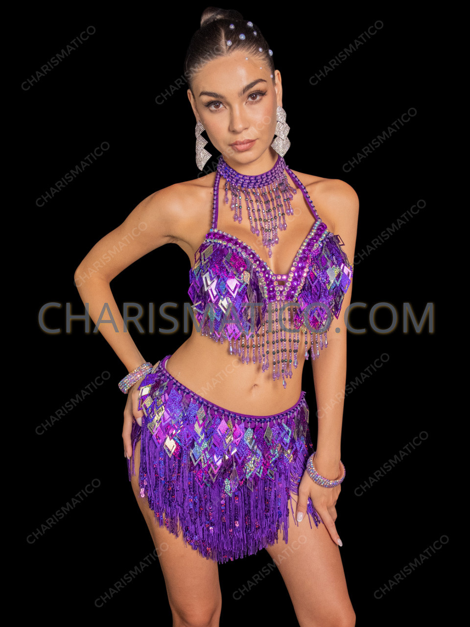 Radiate pure energy and glamour in this Vibrant Purple Diamond Sequin Fringe Samba Dance Dress Set — a show-stopping two-piece ensemble designed to move with dazzling rhythm. The bra top features an alluring halter neckline embellished with sparkling rhinestones and diamond-shaped holographic sequins, creating a multi-dimensional shine that captures every light on stage. The matching skirt shimmers with layers of fringe and reflective sequin panels, giving fluid motion and vibrant bounce with every step or spin. Perfect for samba, carnival, Latin, or cabaret performances, this radiant purple set embodies bold femininity, sparkle, and unforgettable stage presence