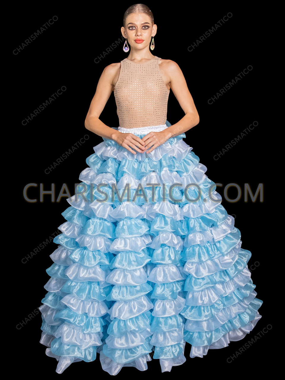• Layered Organza Ruffles – sky blue and white tiers for a striking, glamorous look.