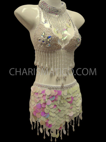 • A customized sequin and bead decorated bra and skirt set with matching necktie that is perfect for showgirls, cabaret and burlesque, or Carnival.