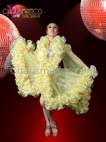 White Swan coat coz life is gorgeous!  This coat has a transparent white organza body with matching white ruffles. This white boa coat goes all the way down to the floor and has big ruffles all over. It is also made out of shiny material making it perfect to wear on stage while performing.