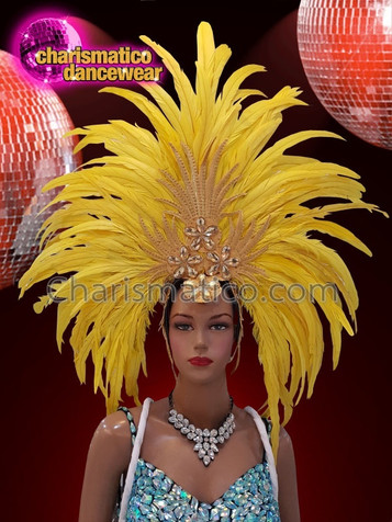 Samba flare and Egyptian colors come together in a wonderful fusion in this magnificent headdress. Bright mustard yellow feathers form the large bulk of this headdress, adding the energy of Samba. Bright gold and silver tear drop crystals and sequins add the sophistication of an Egyptian princess.