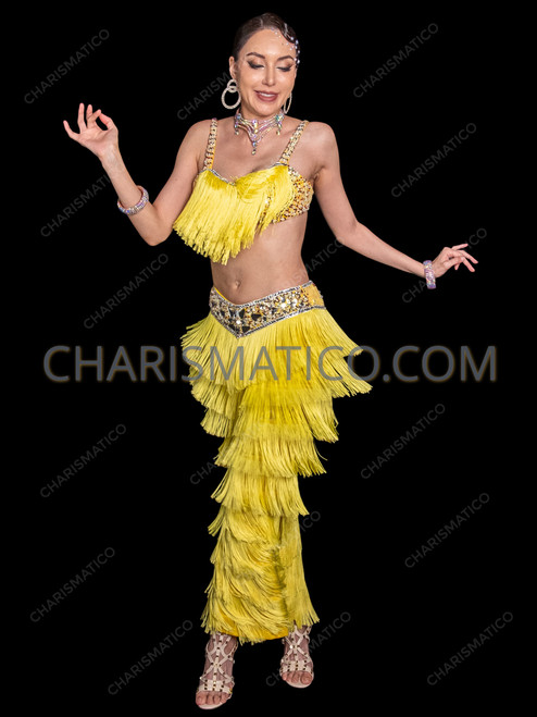 Turn up the heat on the dance floor with this dazzling Yellow Fringe Latin Dance Pants Set. Designed to command attention, the set features a radiant sequin bra top adorned with sparkling rhinestones and playful front fringe that moves with every step. The matching high-waisted pants are layered with cascading tiers of yellow fringe, creating eye-catching movement and rhythm as you dance. Perfect for Latin, samba, or carnival performances, this ensemble is a celebration of vibrant color, dynamic motion, and stage-ready glamour—ideal for dancers and showgirls who live to shine.