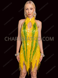 Step into the spotlight in our Yellow High-Neck Beaded Fringe Drag Queen Dress, designed to command attention with every move. Crafted entirely from shimmering beaded fringe, this statement piece delivers dramatic movement and nonstop sparkle under stage lights. The vibrant yellow base is enhanced with a strategically placed green accent pattern that creates a slimming illusion, visually contouring the body for a sleek, hourglass effect. The high neckline offers elegant coverage and secure support, making it perfect for high-energy drag performances, cabaret shows, and carnival-inspired stage acts. Bold, dynamic, and unapologetically glamorous, this dress is made for queens who own the stage.